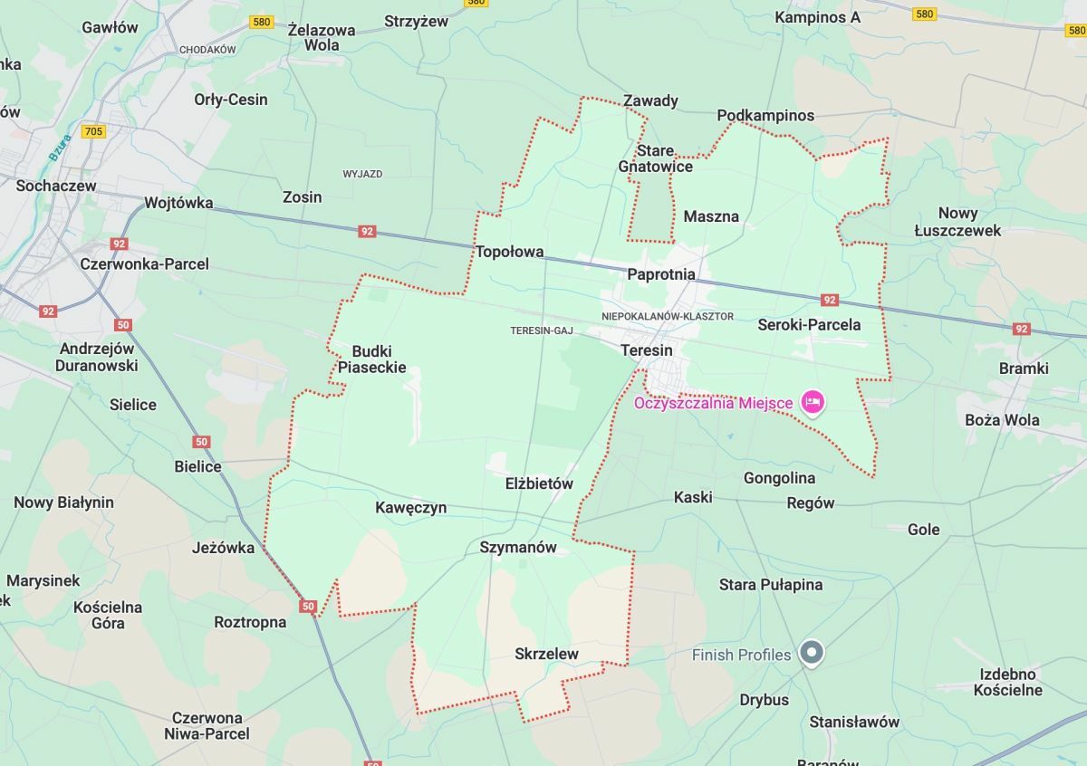 Lokalizacja przylega do DK92 (trasa poznańska) z bardzo dobrym dojazdem do A2 (18 km) i DK50 (12 km). Wjazd na trasę zaprojektowany pod duży i bezpieczny ruch samochodowy; sygnalizacja świetlna. Blisko do PKP Teresin Niepokalanów i centrum Teresina.